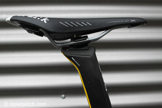 A Fizik Arione CX saddle is perched on top of the aero seatpost.