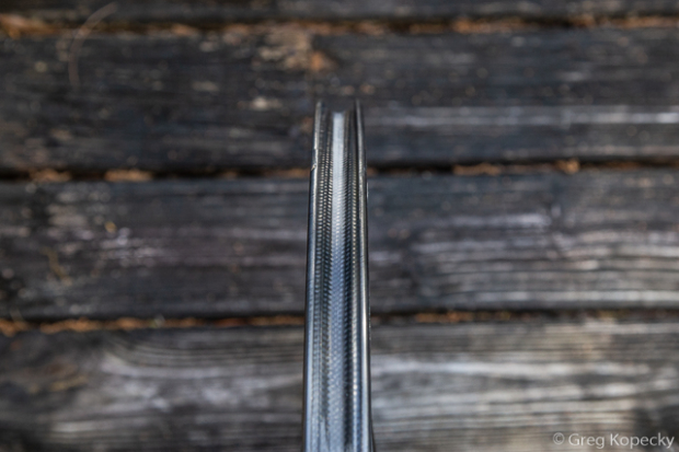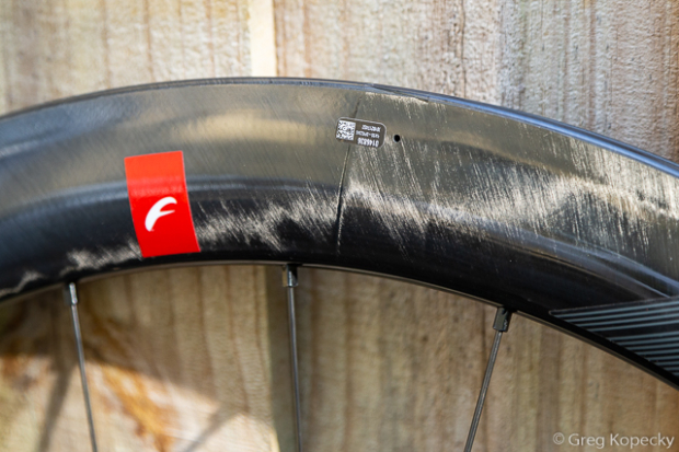 The rims feature external spoke nipples for quick tension adjustments. Aerodynamic penalties can be debated, but I generally prefer this nod towards serviceability. A small drain hole / pressure release hole can be seen above on the sidewall of the rim.