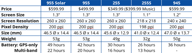 - Longer battery life: GPS-only mode 42 hours compared to 36 hours on the 945. (Up to 49 hours with the 955 Solar.)