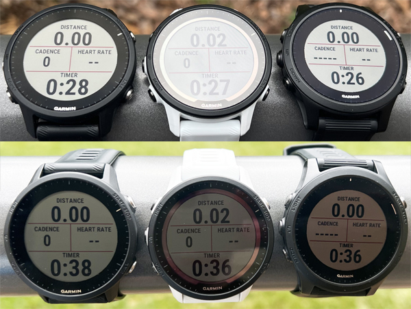 The 7% photovoltaic (PV) level collector over the LCD area is half the 15% PV of the newly introduced 1040 Solar, so it has some light absorption compared to a clear screen. Therefore, the screen looks slightly darker and slightly more reflective than the standard screen in certain lighting conditions. It captures a little bit of the light as it passes through to the LCD and then a little more after the light reflects back out to see. It is not much, but the screen can appear a little washed out in mixed light with shadows or light reflecting at an angle. The comparison pictures below are the Forerunner 955 Solar in the middle, flanked by the Forerunner 955 on in the left and 945 on the right. The angles are intentionally framed to call out the difference, but it does not look anything like this in regular use. The straight-on shot is direct light and not that different. Also, the new 955 screen is better than the 945 screen shown, and you really notice it in the non-Solar comparison.