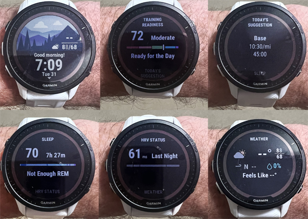 The Morning Report is another fun feature that has been around on other devices like the Suunto 9 and Apple Watch. When you wear the watch to bed, the next morning you will have the “Good morning!” screen waiting for you to give you highlights of the day. It has training readiness, recovery time, suggested workout, sleep analysis, HRV, and weather forecast. It is just fun. I really like it for HRV, because it is tracking and charting HRV in the background, so I can review charts and daily data to better understand the metric and how it aligns with my training performance. All of these metrics are also available in the glances, but the Morning Report offers them up to you each day without having to search and scroll around.