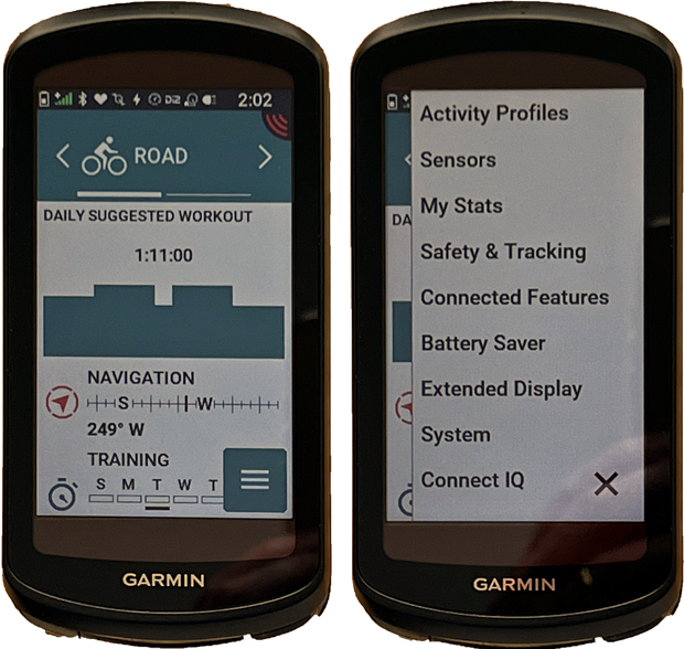 Garmin has had the same general user interface on their top three bike computers for as long as I can remember – maybe since the 510 in 2013. The old UI was familiar, but it had a couple mixed menu levels that are not intuitive for new users. The new UI is a scrollable list through some of the same selections (ride, navigation, training, history) and it adds new Glances like Notifications and Weather. The list is fully customizable like the watch Glances. You can add Cycling Ability, Training Status, Power, V02 Max, Training Load, Load Focus, Recovery Time, Location Search, and Sunset/Sunrise. Then, the menu button on the lower left opens a slide out panel from the right with the configuration options like on the prior generations. And it moved Connect IQ from the bottom of the screen into the configuration menu. Overall, this follows modern user interface design standards while adding a little more pop to the main screen. It will probably take a few uses to adjust, but most users will probably like the new look.