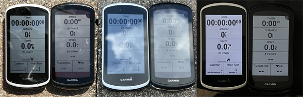 The comparison pictures below are of the Edge 1040 Solar and Edge 1030 (the Edge 1040 would look better), but the Solar and non-Solar watches have similar screen differences. The direct light comparison is what it looks like most of the time. The one with the clouds reflecting in lower light and indoor (both with the same Auto backlight setting) show the differences in less ideal conditions. When the displays have the same manual backlight setting, the 1040 Solar blows away the older 1030.