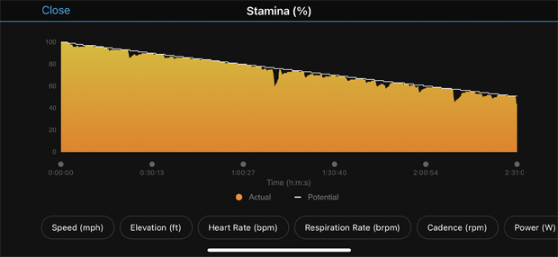 Real-time Stamina extends this feature from the Forerunner 955 Series to the Edge 1040 series. It is a widget for the 1040 along with new analysis charts on the mobile and web apps. It is two metrics together – your current available stamina and your potential stamina. The idea is that you have a full bucket of stamina, and you draw from that bucket during an activity. So, if you are cycling evenly (like in a time trial or triathlon), the two would track together. But when you attack a climb, the real-time percentage might start dropping rapidly toward zero until you top the hill and recover. That might lower the potential slightly as well, and then as you recover the real-time would climb back up again to intersect with the potential figure. This is new, so watching it as you train and race will help inform how well it works for you. This is great on a bike, where frequent climbs and attacks exact their toll. The chart below shows a long ride and how the widget saw my hill climb attacks along the way. The widget on the watch presents the data to you in real-time. I had another ride where I won a KOM, and I wanted to show what that does to the “Actual Stamina” line, but HRM was off, so it did not calculate stamina. This feature is a lot of fu