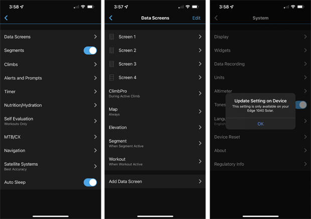 - New UI: User interface refresh that shows your insights and glances on the main screen with a traditional settings navigation button to all of the Edge 1040’s features