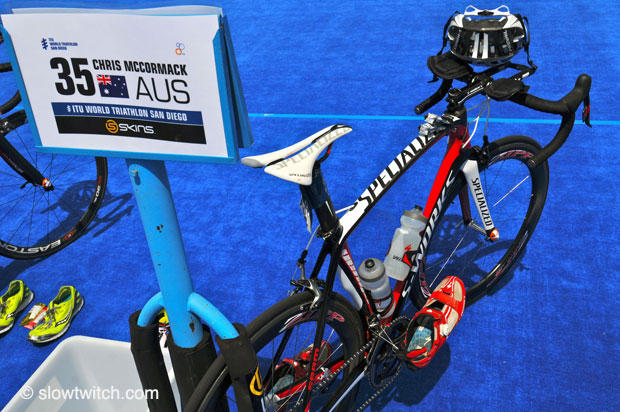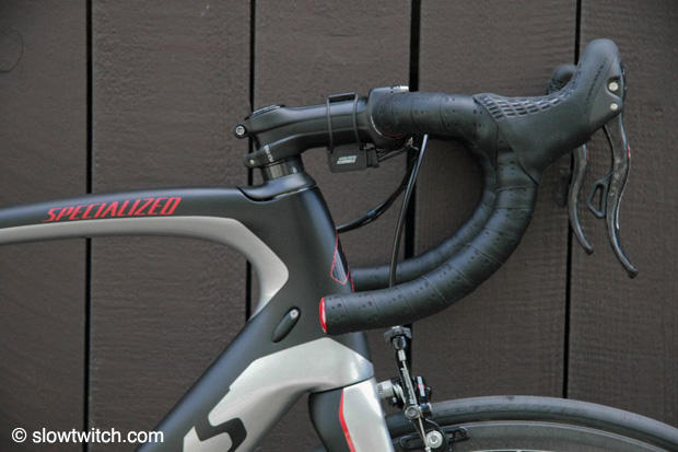 Campagnolo Super Record shift/brake levers are mounted to S-Works Tarmac carbon bars and an S-Works ProSet stem.