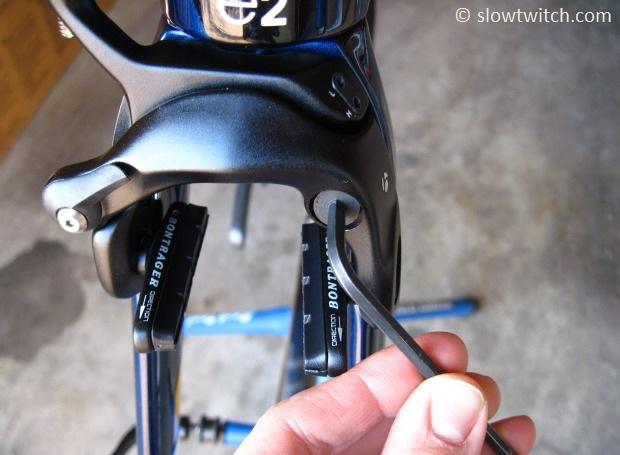 To set up the pad properly within the braking surface, I followed my normal procedure – loosen the pad bolt with one hand, squeeze the brake lever with the other hand, and tighten the bolt.