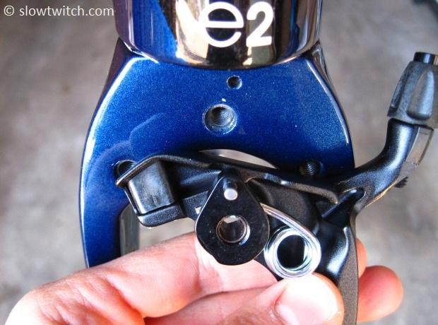 Now that we have the limit screws taken care of, let’s mount the front brake. There are two 4mm flat-head hex bolts; one for each of the two main arms. Note the small ‘nub’ that mates with a matching small hole on the fork – the brake uses this as a point of leverage.
