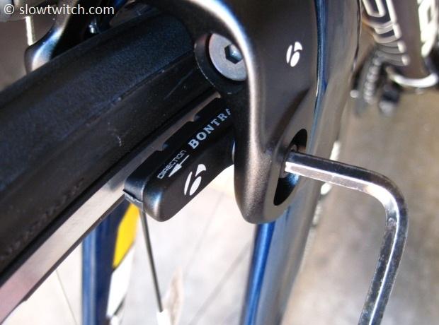Just where do I set up those pads? What about wide rims? The stock wheels with this bike are Bontrager’s updated Race X Lite model (which we reviewed in 2012 – linked at the bottom of this page). These wheels follow the trend of wider-is-better, and have 23mm rims (measured outside-to-outside at the braking surfaces).