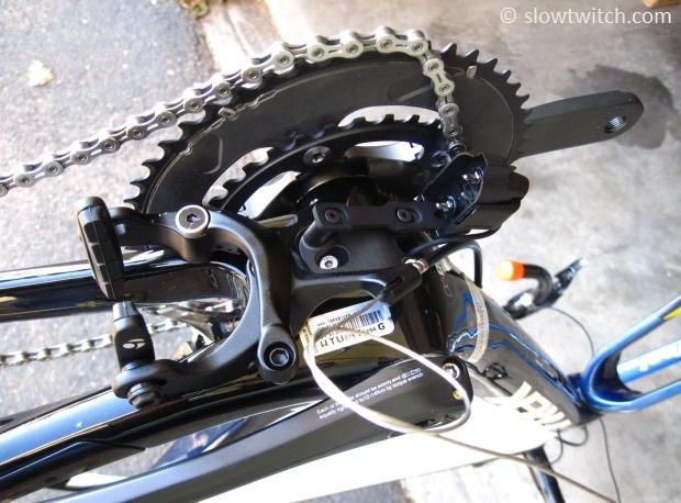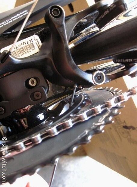 I could adjust the first screw (on the left in the above photo), but had trouble reaching the second screw (on the right). Whether or not you can reach these will ultimately depend on chainring size and type – you obviously would have much more trouble with a solid TT ring. I ended up using the short end of an L-style 2mm allen wrench to adjust the screw on the right, but could only do about 1/8th turn at a time. This job is likely best done with the cranks completely off the bike – similar to many other hidden-rear-brake bikes.