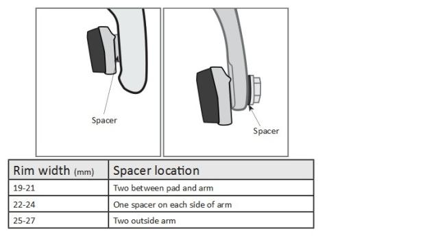 Bontrager did the math for us to accommodate various rim widths. Each brake arm has two washers that may be moved to either side, to space the pads appropriately: