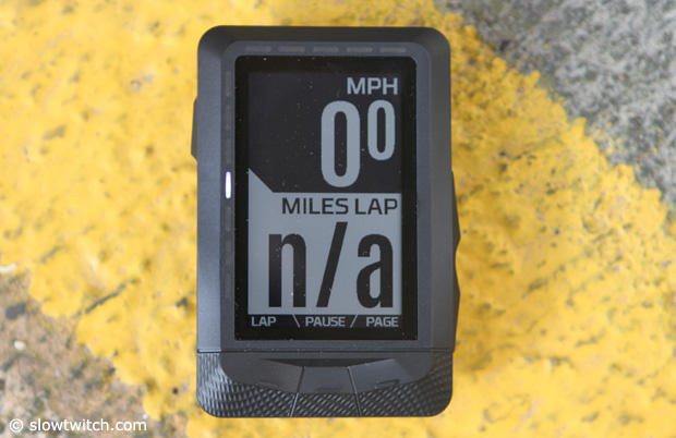 The device has three buttons on its front which, for those riding in a TT position, are easier to use than the common placement of buttons along the side of a device (which can be difficult to press if crammed between aerobar extensions). These buttons control all the major functions such as pause, switch screens, lap. There are also 2 buttons along the right side that can control the number of data screens displayed. I did notice that the front buttons require a bit more pressure than other bike computers so I recommend that the aerobar mount is firmly fastened.