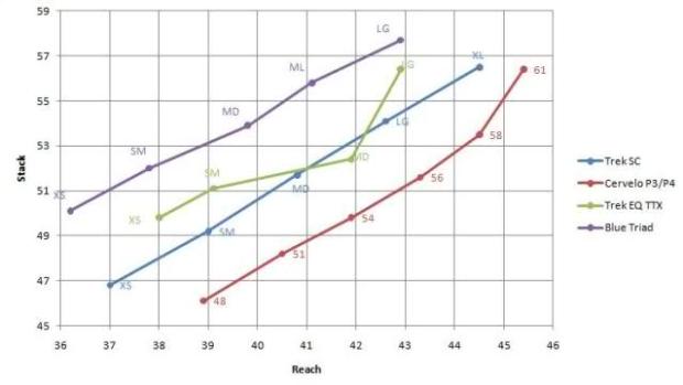 Triathlon, not so much. Here's a data point for you. Felt's IA in size 56, Quintana Roo's PR5/6 in size 54, Cervelo's P2/3/5 in size 56, Dimond's size M and Trek's Speed Concept in size L are virtually identical geometrically. They are all roughly built with a stack of 540mm and a reach of 425mm. This is Trek's geometry, that is Trek is the company that first chose this geometry for its Speed Concept in 2011. You can see in the chart above how certain bikes coalesce around this geometry in size M and L, and as you can see you can throw Argon 18 and Orbea into this mix.