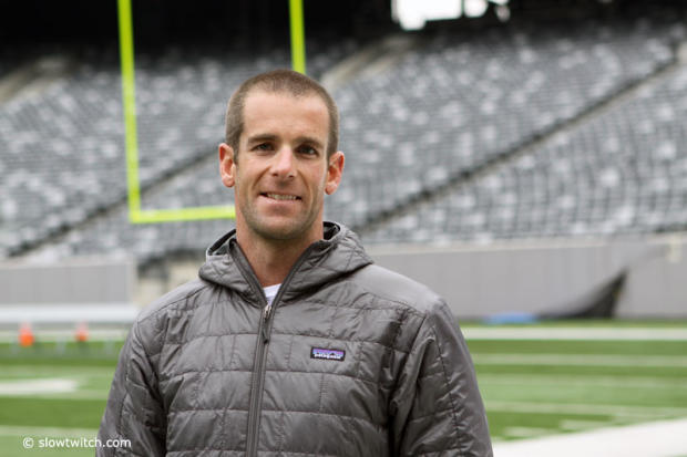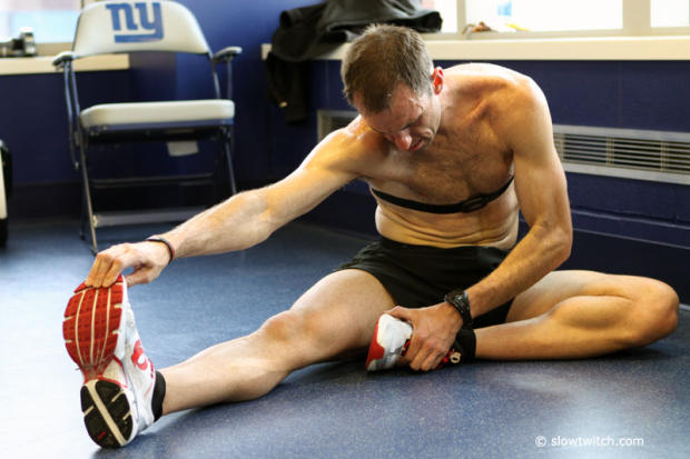 After the hard effort Tim Hola is stretching in the area usually busy with New York Giants.