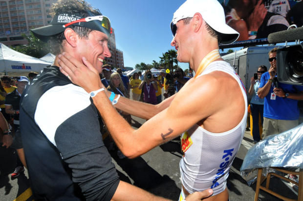 Michael Raelert shares a warm hug with his brother-coach Andreas after the win.