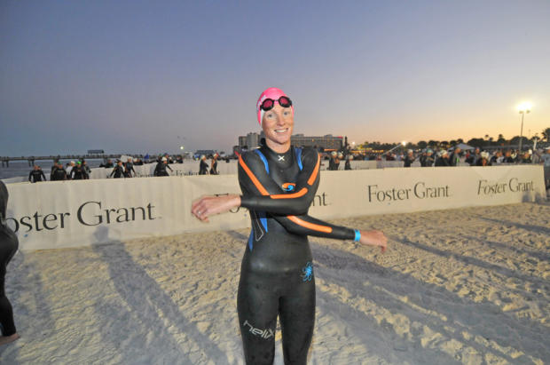 Leanda Cave stretches before the swim. She felt happy and confident after a win at Miami 70.3 two weeks before, and was happy with her best-ever 2nd at Clearwater.