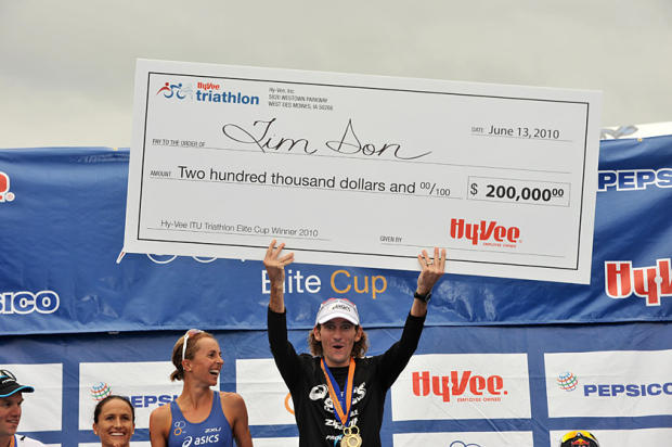 Tim Don wasted all but three seconds of his big lead soaking in the cheers of the crowd before seizing the finish line banner.