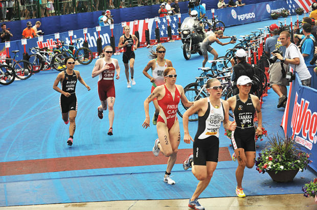 Sarah Haskins grits her teeth coming out of T2 on her way to a disappointingly off-form 16th overall and a 38:15 run.