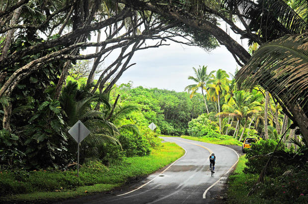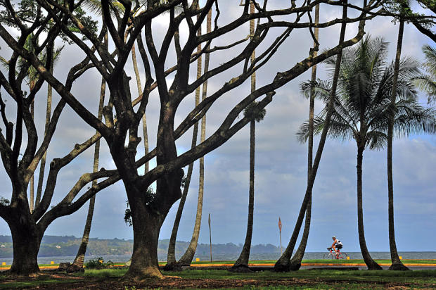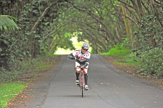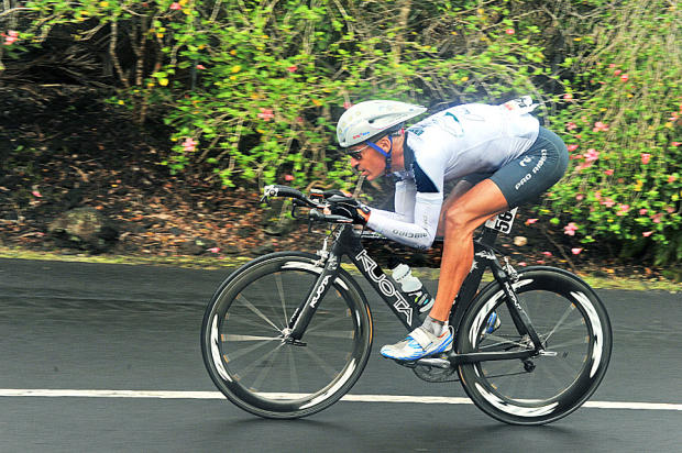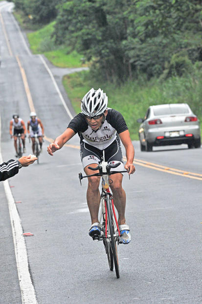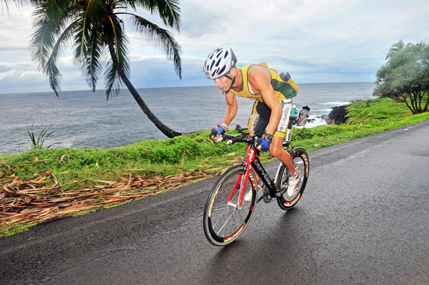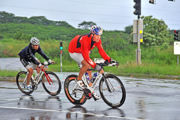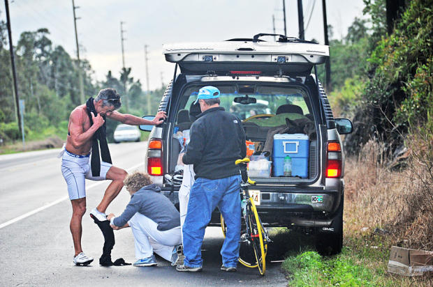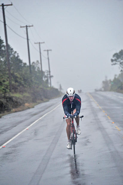 The 2011 Ultraman Day 2 started with a 30-mile downhill ride from Volcanoes National Park in a light rain that passed a downed tree at Mile Marker 21. After a scenic seaside jaunt past canopies of trees on what is known as the Red Road (once paved with crushed red rocks, now re-covered with new licorice-black pavement) the riders turn north toward Hilo and its lovely trees and rain-fed greenery. Next the headwinds picked up on the 30-mile northward leg to Honoka'a before attacking a big hill toward the famed Parker Ranch and the town of Waimea. And on this Saturday, the subsequent ascent of the Kohala Mountains is where the wild winds wailed and riders held on to their handlebars like rodeo cowboys trying to hold on to two-ton bucking brahmas as they battled head- and side winds gusting to 50 miles per hour. The elites blasted through somehow, but some folks walked their bikes through the tough spots and others decided they didn’t want to dare the precipitous declivity in those winds and packed it in.