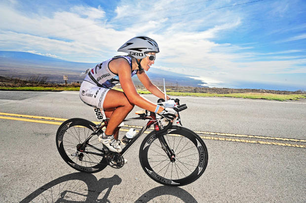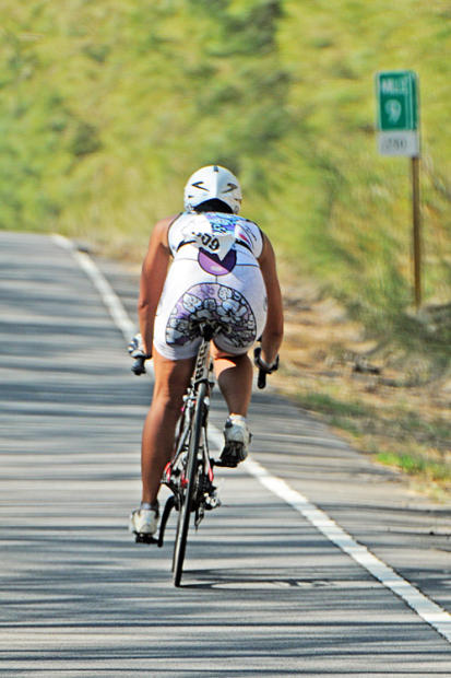 Amber Monforte nears the summit of the Kohalas with the Kona coastline far below. Her 8:31:04 split was 6th fastest of the day.