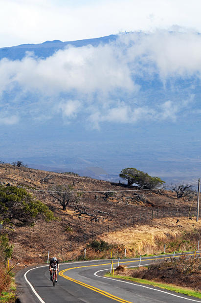 Gary Wang ascending the Kohala climb – with the Mauna Kea Observatories in the background.
