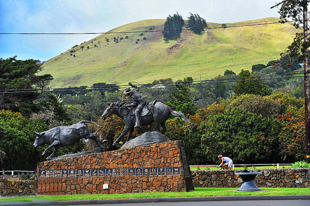 Jonas Colting rides past a Waimea statue honoring the Hawaiian Paniolo cowboys who helped establish the Parker Ranch. Colting posted a 4th-best 8:08:21 on the day to hold on to the overall lead.