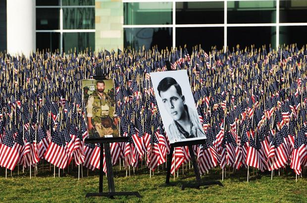 Magnificent memorial flags fill a lawn near the triathlon finish.