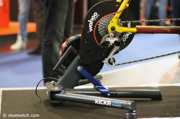 This Wahoo Fitness trainer can be controlled with an iPhone, and wattage is measured with strain gauges.