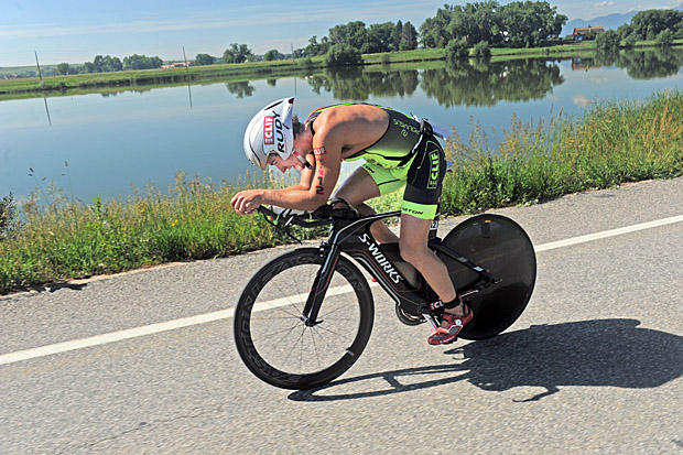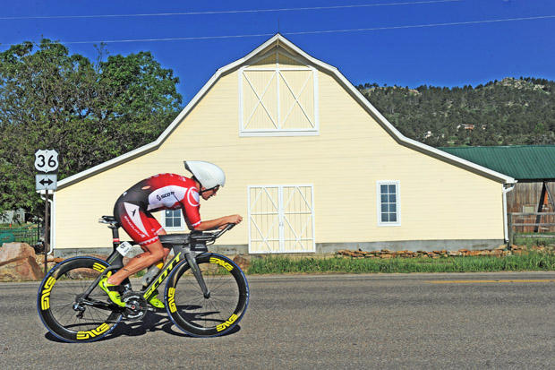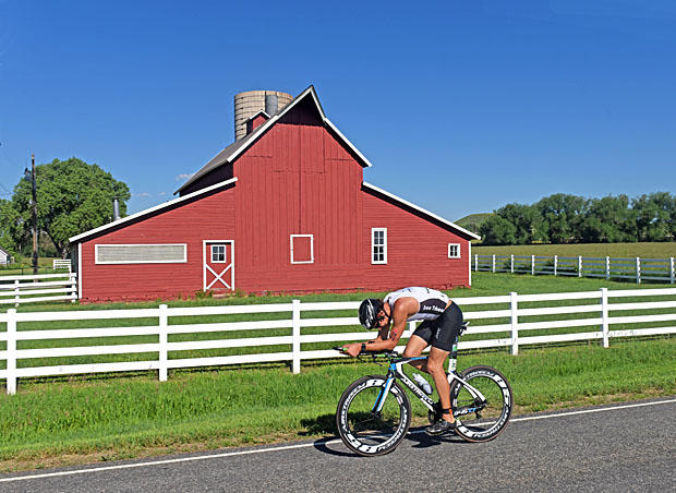 Paul Ambrose rides past a Boulder County farm on his way to a 2:07:11 bike split and 7th place.