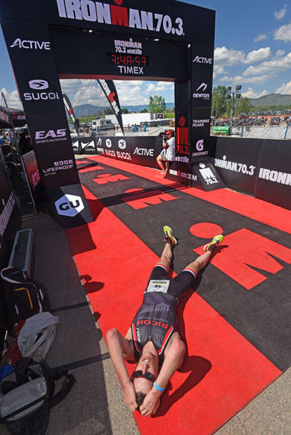 Exhausted, Mark Bowstead lays out on the finish area after his 1:20:07 run and a 3rd place finish.