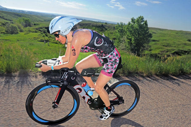 Alicia Kaye gives it the Michael Jordan tongue hanging out look as she pushed her aerodynamic Ventum to the women’s-best 2:15:40 bike split.