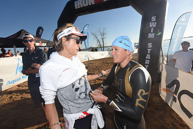 Coach Siri Lindley confers with her athlete Jodie Swallow, last year’s winner.
