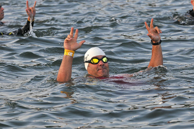 Air Force Captain James Bales, an orthopedic surgeon who treats many wounded warriors from the Iraq and Afghanistan wars, cools off after finishing second to elite winner Nathan White.