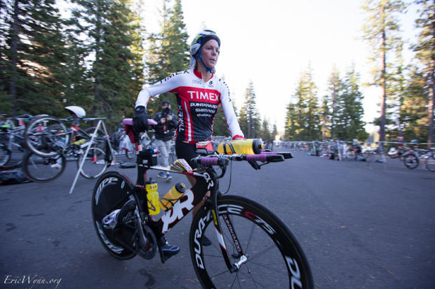 Christine Anderson of Team Timex is ready to take on the brisk early morning bike segment. She eventually won the race.