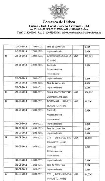 Included in the 22-page court document was a list of all the credit card charges that Pedro Gomes made with the card of Costa, and that list alone spans over 5 pages and lists 41 separate charges. A snapshot of which can be seen below.