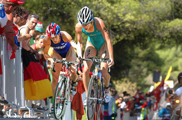 Women: At the 2004 Olympics in Athens, Kate Allen of Austria was 44th after the swim, 2:01 behind leaders Australian Loretta Harrop and Sheila Taormina of the U.S. After the bike and T2, Allen was in 28th position, 2:53 behind Harrop. After her race-best 33:47 run, Allen beat Harrop for gold by 7 seconds.