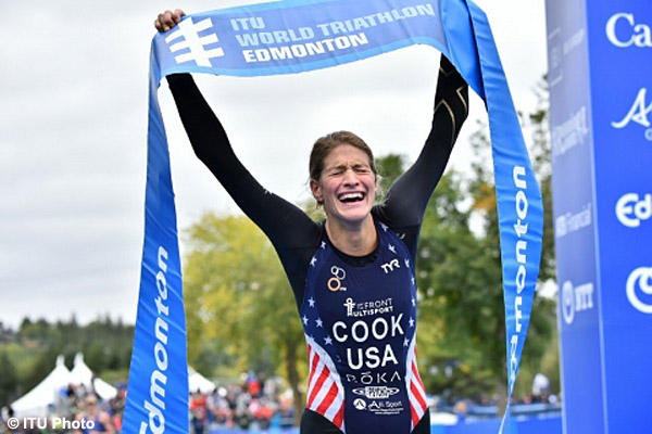 Cook ran away from the field with a race-best 16:41 split for the 5k run to finish in 59:43 with an 11-seconds margin of victory over Ai Ueda of Japan and 32 seconds over fellow American and 3rd-place finisher Renee Tomlin.