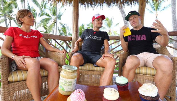 Javier Gomez, Mat Steinmetz and Jesse Thomas assist Callum Millward in this episode of Cupcakes in Kona interviewing random folks at the pier before the race.