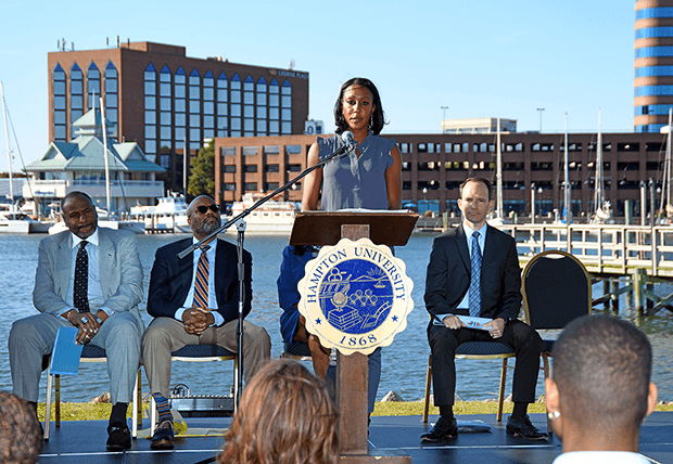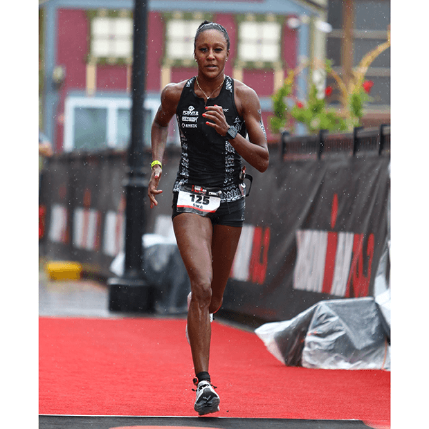 [PHOTOs: In the image just above, Sika is speaking at the announcement of Hampton University becoming the first HBCU to add a women’s triathlon team; image courtesy of Hampton University; just above that, her first time breaking 1:30 on the run at IRONMAN 70.3 Atlantic City.]