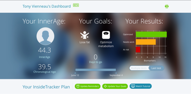 After purchasing a plan customers receive an email with a link to create an account on InsideTracker. As part of the account set-up users are prompted to answer a few health, fitness, and lifestyle questions that are used to assist in providing individualized recommendations based on the results of the lab work. The response to these questions, along with the results of select biomarkers, are used in a metric referred to as “InnerAge”. Look at this as your FTP for health. InnerAge is the difference between your outside age (i.e., chronological age) and your inside age based on your lifestyle and your inner workings (i.e., how old your body thinks you are).