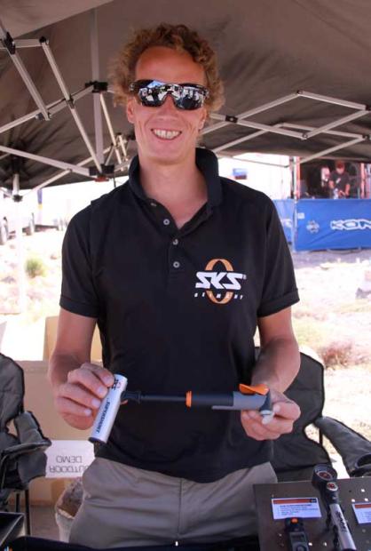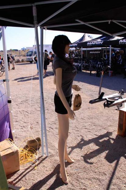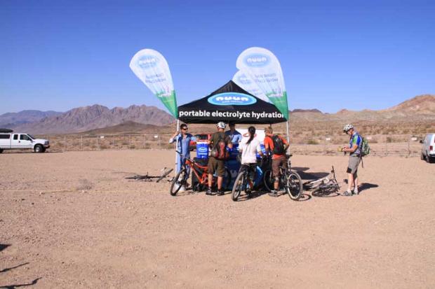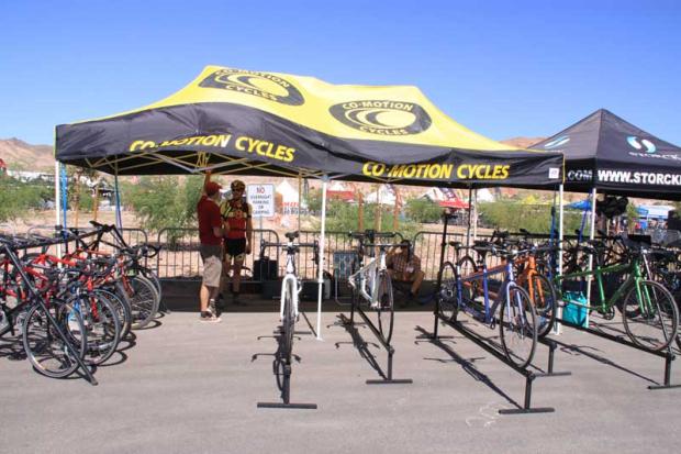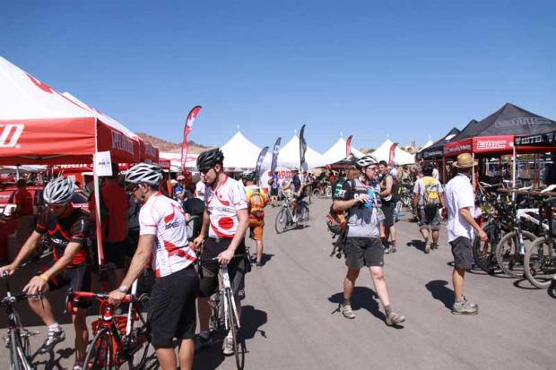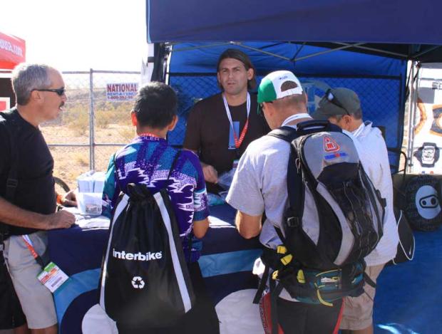 The early morning wasn't too busy, but as the day went on, more and more dealers and industry folks showed up to see what they could test ride in Bootleg Canyon. Temperatures had cooled down from the 108 and 109 temps of the last days to a more civil 99 degrees plus a good breeze made conditions a bit more comfortable. But the wind was less fun for the cyclists on the course and the vendors positioned on the dirt.