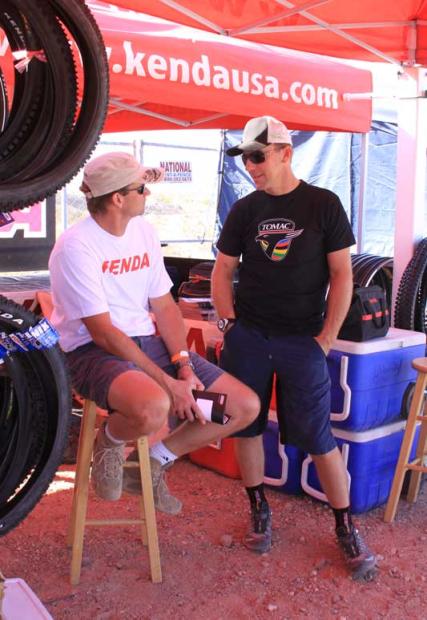 John Tomac chatting with someone at Kenda, but he also has a demo fleet there