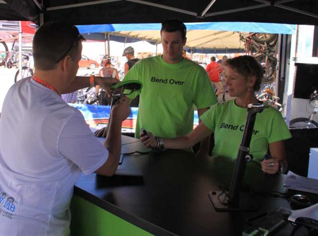 A little contest in the Fizik booth tested people's skill to put a saddle level on their new seat post. Fast times were in the 21-22 second range.