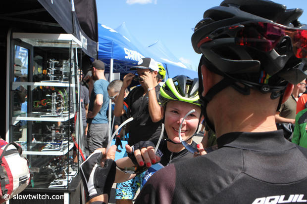The Smith Optics booth was busy all day. Hey let me try yours, and I'll let you try mine.
