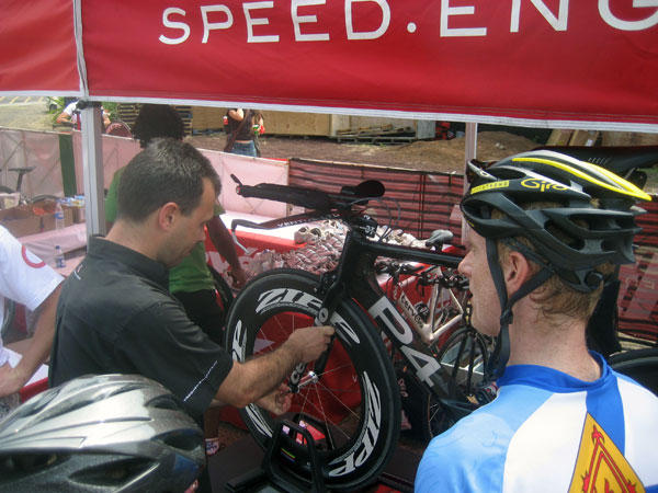 Little touch ups on the Team Timex bike of Alex McDonald in the Trek booth.