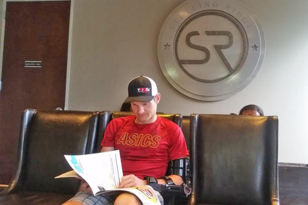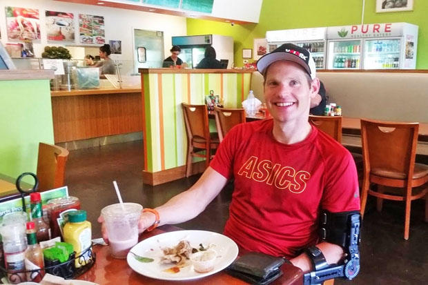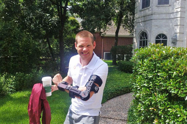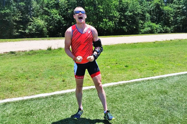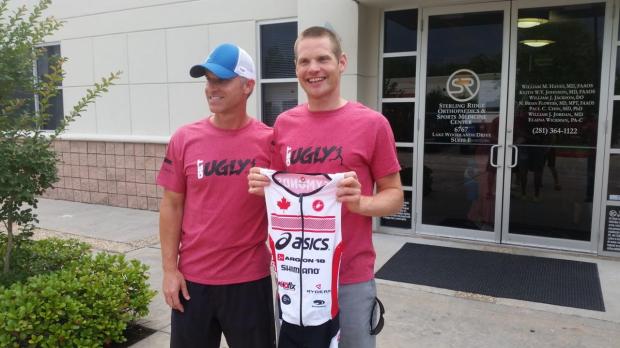 2015 IRONMAN Asia Pacific Champion Jeff Symonds travelled in to The Woodlands, Texas from Victoria, Canada two weeks in advance of race day in order to get himself acquainted with the muggy conditions, the race course and the local community. Unfortunately while previewing the course following one of the strong rains that hit the area last week, Symonds crashed on his bike and a subsequent x-ray revealed a fractured elbow. Not one to roll over quickly, Symonds has stayed in town to carry on with his pre-race preparations in hopes of lining up at the start on Saturday.