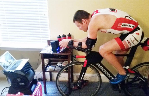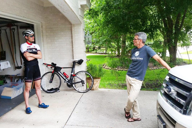 After a quick indoor cycling session on the CompuTrainer, Symonds and Lyons chat over coffee. With over 50 age-group athletes racing IRONMAN Texas, Lyons is a man on the move during race week.