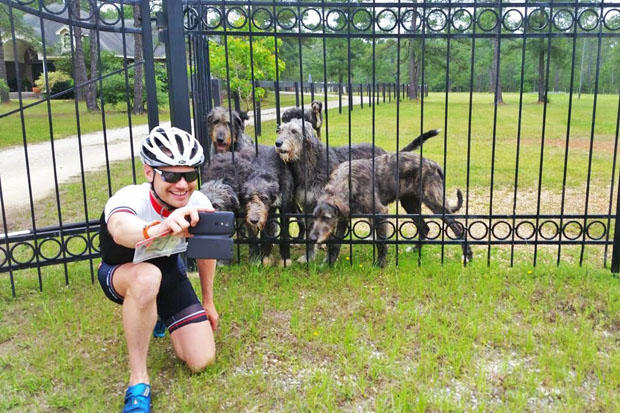 Out on the ride around Woodlane, a popular route for area cyclists, Symonds found some new friends and managed to snap a selfie with the pack of Irish Wolfhounds.