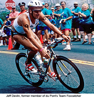 In essence, the Team Foxcatcher episode is joined with Team J David as peculiar asterisks in the history of triathlon. Back in the early 1980s, La Jolla financier Jerry Dominelli, later charged and convicted of defrauding investors of $200 million in what amounted to an international Ponzi scheme, founded a triathlon team supporting the biggest names in the sport – including Scott Tinley, Mark Allen and Scott Molina. Just as with Team Foxcatcher, the triathletes had no participation in the shady aspects of their sponsors. After year or so of the high life, Team J David disappeared in a cloud of prosecution and litigation.