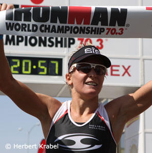 Anna Cleaver led Emma-Kate Lidbury out of the water in 20:12 and 2011 70.3 World Champion Melissa Hauschildt (nee Rollison) took 22 minutes to exit the Savannah River. Hauschildt's race best bike effort of 2:20:45 combined with a quicker swim-bike transition than Lidbury put her into the race lead going into the run, but Lidbury was right there too. Cleaver's 2:30:23 allowed the American to stay near the front, but she had been passed by the hard charging Tamara Kozulina who managed a 2:25:44 bike effort after her 24:29 swim. Hauschildt though showed that she is back in form and closed out the day with a race best 1:20:46 run to win the title. Lidbury hung on to second place and Kozulina finished third.